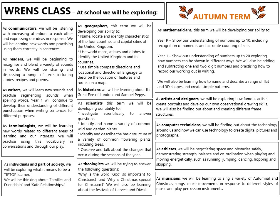 Our Wrens are a mixture of Reception and Year One children. This means that they are following the Early Years Foundation Stage Curriculum (EYFS) with some National Curriculum opportunities.
